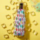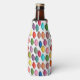 This bottle cooler has a mid-century modern design of sets of three leaves in fading shades of retro colors.