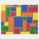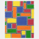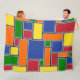 This large fleece blanket has a Bauhaus design of rectangles formed with gray lines and filled with red, yellow, orange, blue, and green on a field of black.