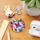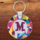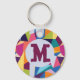 This keychain features an abstract bold and colorful design of geometric shapes. Customize your design by easily adding an initial, featured in magenta font (can be changed to any color of your choice).