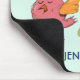 Personalized mousepad with a trio of cute and whimsical hand-drawn birds. 2 of the birds are standing together with some tiny green pine trees in between their feet. Another blue bird is flying up in the air between them. Mint green background.