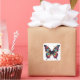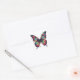 A vibrant illustration features a symmetrical butterfly with intricately patterned wings. The wings are adorned with a mix of colors including pink, teal, and yellow, set against a dark gray base. Small, colorful dots are scattered around the butterfly, adding to the whimsical feel. The background is solid black, which accentuates the bright colors of the butterfly.