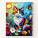 A sweet personalized notebook with a cute illustration of a colorful abstract cat surrounded by flowers, butterflies and the sun in a paper quilling impasto style.