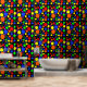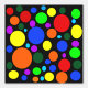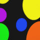 Colorful abstract geometric design, blue, red, yellow, green and pink bubbles on black background