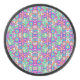 Colorful circular floral pattern with symmetrical designs featuring flowers and leaves in vibrant pink, blue, and green tones on a puck-like object.