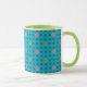 A fun White Ceramic Coffee Mug with a Green Lip and Handle and Polka Dots of varying sizes in Pink, Orange, Blue and Green, on a White background that you can change if you wish (Turquoise shown). This pattern coordinates with the Posh and Painterly "Fish in the Sea" collection and can be adjusted to fit any Mug.