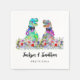 This same-sex wedding custom napkin is easy to customize with both grooms’ names and the wedding date using clean, modern script typography. Bright watercolor florals surround the dinosaur groom and groom illustration, showcasing a bold rainbow palette of pink, red, blue, yellow, teal, green, and purple for maximum visual impact.