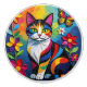 A vibrant and colorful artwork depicting a folk art style cat surrounded by flowers and butterfly with a paper quilling effect. Beautiful and bright knobs for dresser drawers, craft projects or kitchen cabinets for those who love cats in blue, yellow, orange, red and purple.