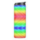 Colorful geometric travel mug with a rainbow pattern, featuring vibrant diamond-shaped designs. The black lid adds a sleek contrast to the bold hues.