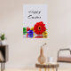 Happy Easter illustration featuring colorful foil wrapped chocolate Easter eggs and a red gerbera flower on a light white-grey background.