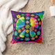 Colorful pillow in a hippie design with a peace symbol on tie-dyed background