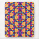Colorful, intricate geometric pattern on a mouse pad, featuring vibrant orange, yellow, and blue shapes, creating a lively and dynamic design.