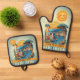 Oven mitt and pot holder set featuring a whimsical colorful illustration in Mediterranean style. A happy sun is cheerfully smiling at your delicious creations!