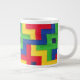 A colourful 'patchwork' design jumbo-sized mug for coffee or soup, in primary red, blue, green and yellow, from a photograph of a patchwork cot-quilt, handmade by Judy Adamson. A Teapot, Pitcher and Other Mugs with this design also available in my store.