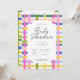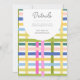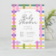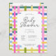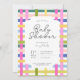 Colorful plaid baby show invitation in a lime, green, blue, peach, pink, and white palette with dark gray font. Customize the scale of the pattern, color and style of the font, to create your dream baby show invitation. Perfect for cottage baby showers, spring baby showers, easter baby showers, summer baby showers, and floral baby showers.