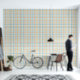 Multicoloured plaid wallpaper with shades of yellow, red, blue, green, and white.