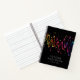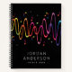 Notebook featuring colourful sound waves and musical notes with your name and custom text on a black background.