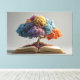 A majestic tree springs from the open pages of an antique book, its trunk rising into a breathtaking canopy of fluffy, jewel-toned clouds in sapphire, amethyst, magenta, coral, golden yellow, mint teal, and blush pink. Sparkling particles float downward like enchanted dust, blending the magic of storytelling with vivid imagination and boundless creativity. Perfect for reading nooks, kids’ rooms, home offices, libraries, nurseries, creative studios, or as inspiring gifts for book lovers, teachers, writers, dreamers, parents, or anyone who believes stories grow worlds.