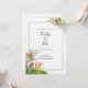 A tropical themed wedding invitation with colorful tropical greenery and florals.
