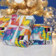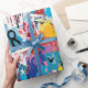 Colorful urban graffiti patchwork pattern wrapping paper featuring bold abstract blocks, expressive brush strokes, scribbles, stars, and mixed-media textures in bright blue, yellow, pink, orange, and black. Energetic and edgy with a modern street art aesthetic, this seamless design is ideal for graffiti art lovers, maximalist style fans, creative teens, and contemporary art enthusiasts.