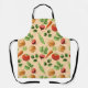 Cute apron featuring illustration of various vegetables including radish, brussel sprouts, onion, sweet pea, carrots, and tomato.