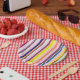 Yellow, pink, purple, blue, green, white , vertical, summer mood stripes paper plates.