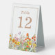 Colorful Wild Flowers Country Wedding Table Numbers Tent Sign features pretty country flowers in orange, yellow, purple and pink on a white background with the table number in the center. Personalize by editing the text in the text boxes. Designed for you by ©Evco Studio www.zazzle.com/store/evcostudio