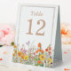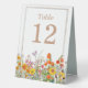 Colorful Wild Flowers Country Wedding Table Numbers Tent Sign features pretty country flowers in orange, yellow, purple and pink on a white background with the table number in the center. Personalize by editing the text in the text boxes. Designed for you by ©Evco Studio www.zazzle.com/store/evcostudio