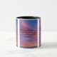 This two-tone mug has the "Colossians 3:13" bible quote scripture KJV in a fine print font with black letters plus bible citation over a picture showcasing a mountain range from distance view under a vibrant coloured sky in this bible verse theme from the King James bible. The rim & handle are glazed in matching colours available in 11-ounce or 15-ounce sizes microwave and dishwasher safe ceramic construction.