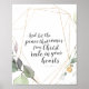 Be reminded of the peace of Christ with this matte poster featuring the Bible verse Colossians 3:15 in script font with a botanical watercolor background and gold geometric accents.