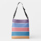 Cross body tote bag in colour block purple, blue, coral, turquoise, and orange. Personalise with your name of whatever text you choose!