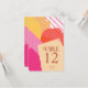 Abstract colour blocking in a bold colour palette of hot pink, tangerine orange and golden yellow provides a striking background for the pieces in this contemporary wedding suite. The wedding table number card shown here is an eye-catching addition to your wedding table decor. Add your names, wedding date and table numbers using the provided template. Search ID740 to see other colour options and additional products with this design.