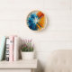Make every moment vibrant with this modern wall clock featuring a stunning abstract splash of colour. The dynamic design blends cool blues with warm oranges and yellows, radiating from the centre like an explosion of creativity. Framed in natural wood and finished with minimalist white hands, this clock is both functional and artistic.
