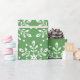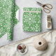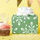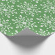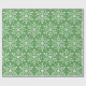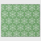 Christmas gift wrapping paper feature white decorative snowflakes leaves on green background.
