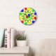 The design is playful, incorporating Roman numerals on colourful jigsaw puzzle pieces in deep red, blue, lime green, and yellow hues, with Roman numerals serving as the clock's hour markers and minute dash tags.