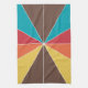 A design with 12 x 30 degree segments each divided with a white line and in a palette of 5 colours with adjoining segments at the top and bottom using the same colour creating symmetry.