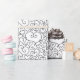 This wrapping paper features a whimsical pattern of scattered hearts in black and white to colour in your own unique style. Colouring fun for kids and adults, too!