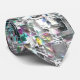 Squared pieces of colourful abstract drawings with some degree of gradient and colour blend that, when observed at long distance, causes a perception of bright coloured similar to CD or DVD, which is further improved with the presence of silver grey and whitish stain.