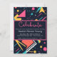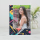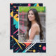 Step into the vibrant world of the '80s with our retro-inspired graduation announcement invitation! Against a backdrop of deep navy blue, bursts of neon pink, electric blue, and lime green form abstract shapes reminiscent of the era's iconic aesthetics. Front and centre, a cherished photo captures the essence of your achievement, radiating pride and accomplishment. Turn the invitation over to discover two more snapshots, showcasing the journey that led to this momentous occasion. Amidst the lively hues, our invitation message beckons: