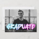 Trendy graduation announcement featuring the graduate's horizontal photo with "Graduate" displayed in colourful 90's-style lettering. Personalise the front of the bold graduation announcements by adding the graduate's name, school, and graduation year. The back of the announcement features a gradient confetti pattern in blue, turquoise, purple, and magenta colours.