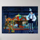 Colourful Abstract Circus Freaks Clown Art. This art is a clown girl giant and a skeleton playing harp music for the carousel.