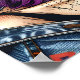 Unique ai art depicting a beautiful modern woman with purple hair, red lipstick, sunglasses with a reflection, fractured art look in a pop art comic style.