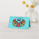 This folded standing place card for your parties, events, and weddings is a bright aqua blue with an abstract scarab beetle who is black with colourful markings in blue, yellow and red. Customise the name and table number area and text on the back with the templates.