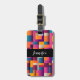 A luggage tag with a colourful abstract background. Bold and exciting colours - pink, blue, orange and more.