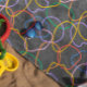 Colourful abstract wavy line in a seamless pattern on a dark grey background.