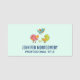 A name tag with a trio of cute and whimsical hand-drawn birds. 2 of the birds are standing together with some tiny green pine trees in between their feet. Another blue bird is flying up in the air between them.