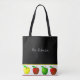 Fun teacher's tote bag done in black, with a white band, along the bottom, with yellow, green, and red apples. White text is ready to personalise for yourself or for your favourite teacher.