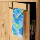 Image of a colourful painting palette, a number of brushes and a palette knife. Blue and green colours prevail. Beautiful vibrant one-of-a-kind kitchen or hand, or feet towel for anyone.