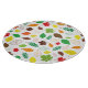 This round cutting board features an autumnal pattern with leaves in yellow, orange, red, and brown shades.