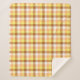 This cosy sherpa blanket features an autumnal plaid pattern in white, yellow, orange, and brown.