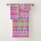 Whether used in your own bathroom or presented as a thoughtful gift, this pink, blue, and orange Aztec geometric pattern towel set brings a sense of style and tranquillity to your daily bathing routine. Wrap yourself in the softness and elegance of these towels, and enjoy the enhanced ambiance they bring to your bathroom.